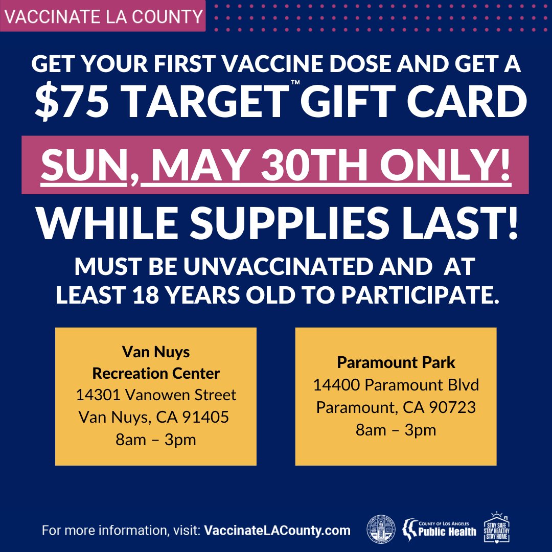 La Public Health On Twitter Get Your First Vaccine At Select Sites This Weekend And Receive A 75 Gift Card From Target Available Until Supplies Last Must Be Unvaccinated And At Least
